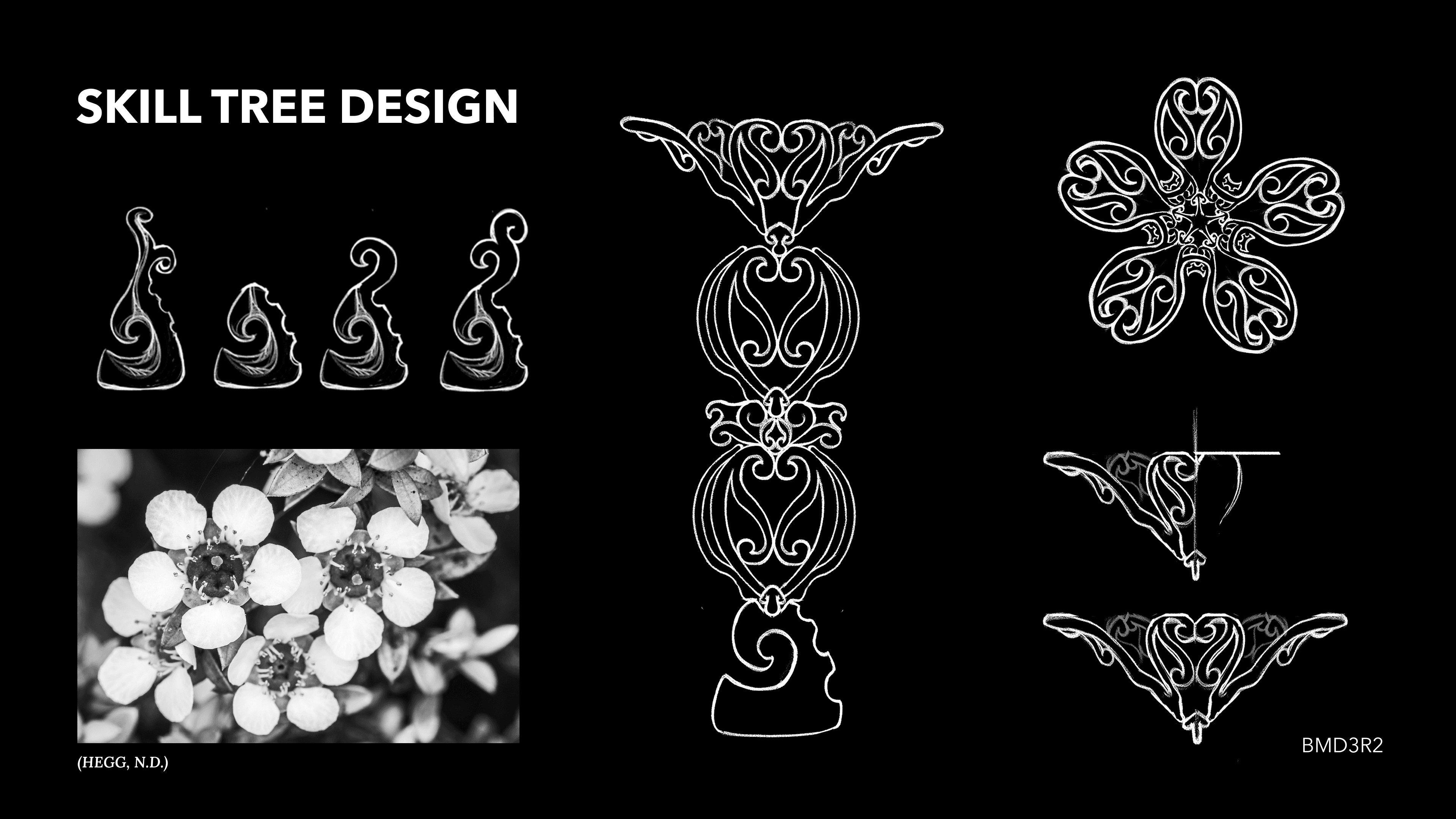Conceptualizing pua (flower) inspired by Kowhaiwhai to be brought to digital life in 3D. Each pua features a pātiki manawa line, to represent an abundance of good things to come in a learner's journey. Attached to pātiki is a variety of koru, koiri, ngutu kura and mangopare, uniquely crafted to create a personal connection to a user's pua of choice.