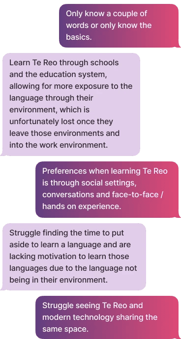 Empathy interviews and surveys were conducted to understand the relationship people in Aotearoa have with Te Reo Maori and/or learning the language.