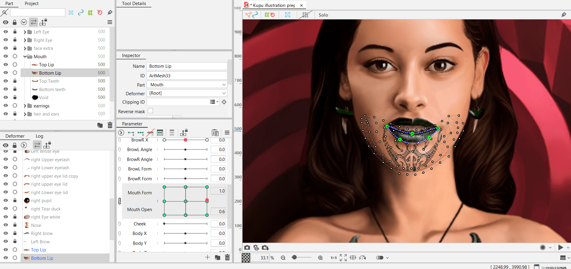 Re-imagining the image to be Papatūānuku, earth mother and learning avatar for Kupu 3.0 using today's technology such as Live2D Cubism. The illustration was broken down into key-components to then be repainted and meshed into an animation. A script written in Te Reo and voice-acted by Sulu Schuster.